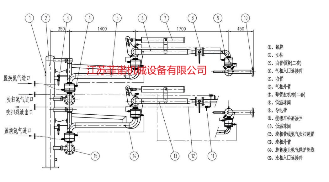 應采用底部密閉帶回氣管線形式,而且是屬于低溫鶴管,鶴管型號一般為AL2543或AL2503,字母AL代表陸用液體裝卸臂,第一位數字2代表底部裝卸,第二位數字5代表液相管的旋轉接頭數量為5,第三位數字4代表氣相管為上翻式,第四位數字3代表液相管形式為下翻式。