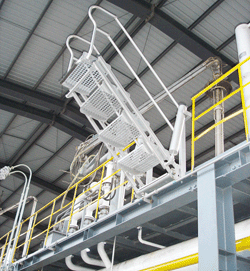 活動梯一般裝于棧橋的邊緣,打開腳踏鎖緊裝置,松開一邊的鐵鏈,放下活動梯,將端踏步靠在罐車上或接近罐車處,掛上鐵鏈。