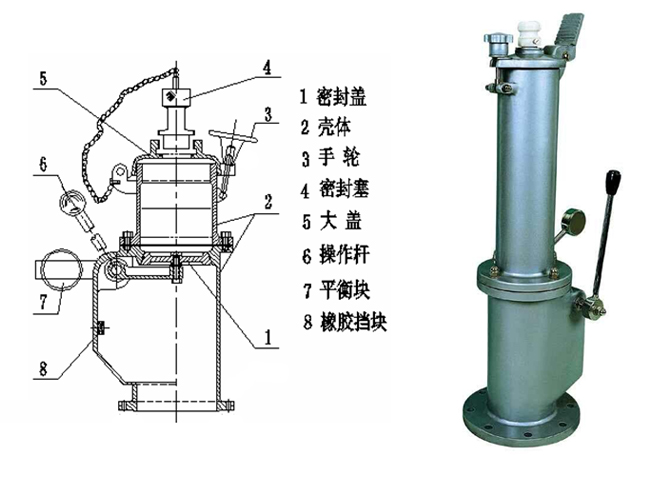 本產品結構如圖示,狹口式量油孔的殼體由一密封蓋將其分成上下兩部分,下部分與儲罐相聯,上部分殼體頂部設有可開啟的密封塞,密封蓋的操作桿(手柄)位于殼體外。測量時,先開啟密封塞4,裝上量油尺器具或其他型式的測量工具,搬動操作桿6,開啟密封蓋1,使量油器具從密封塞的孔內穿過,并插入油品中,完成測量。測量完畢后,取出測量工具,關閉密封蓋,重新裝上密封塞。
